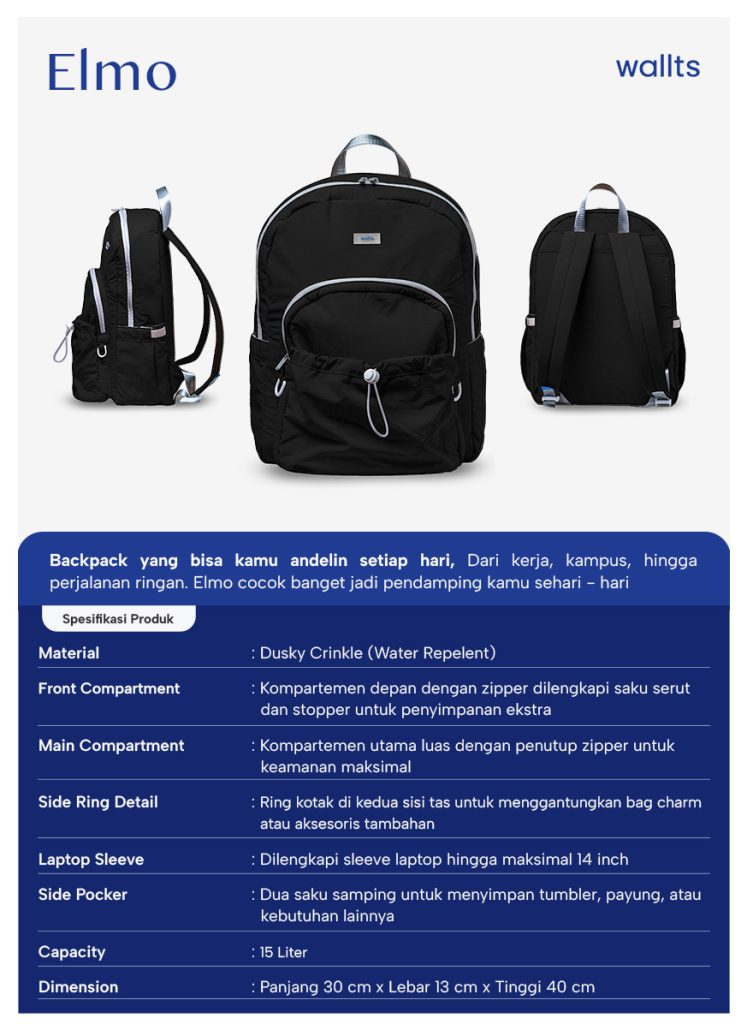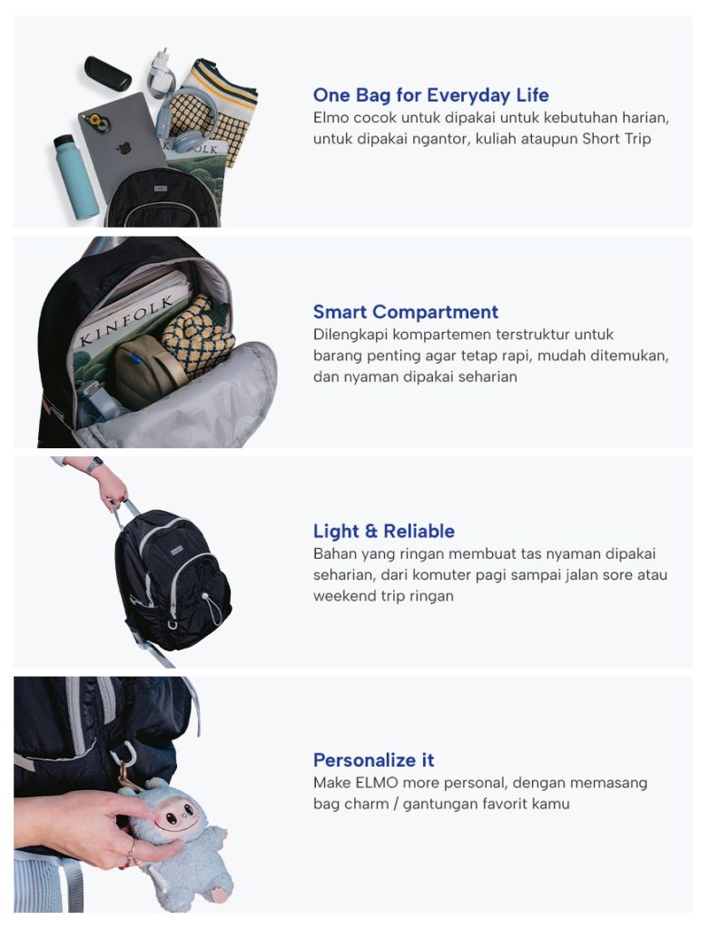 Dengan ruang yang pas untuk kebutuhan esensial seperti laptop, buku, dan barang pribadi, ELMO membuat barang tetap rapi tanpa banyak sekat yang ribet. Desain unisex membuat tas ini mudah dipadukan dengan berbagai outfit. ELMO ini di desain untuk menggunakan material lightweight sehingga tetap nyaman dipakai,